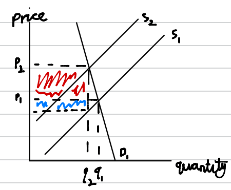 The diagram that the supply for fast food has shifted to the left because of the indirect tax that the government have imposed on firms. As a result, the equilibrium price has increased from p1 to p2, and quantity has fallen from q1 to q2. This is good because it will mean that fast food is no longer being over-consumed, which reduces the externalities and the market failure.