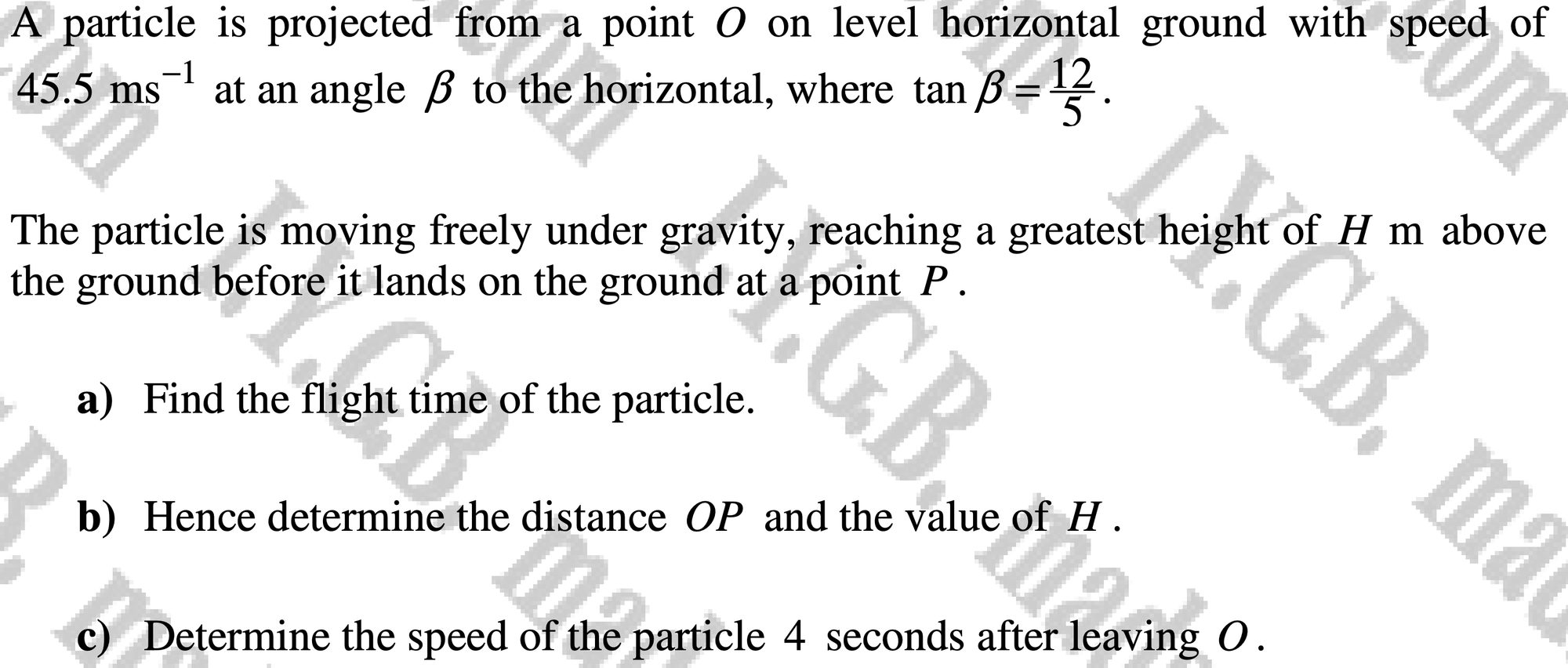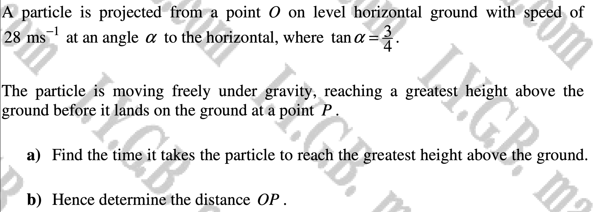 - maximum height: calculate a vertical SUVAT and make v=0 or calculate a horizontal SUVAT and use half the time taken to hit the ground