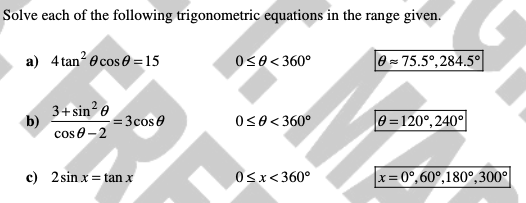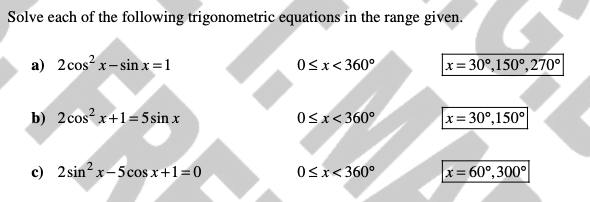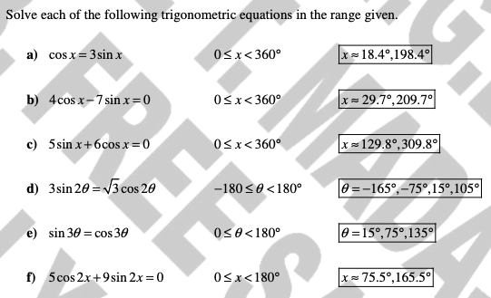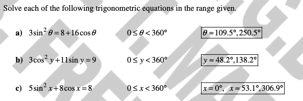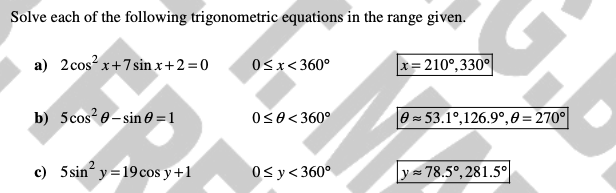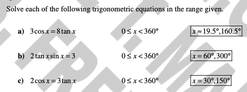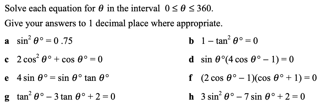 Solve each equation for x in the interval 0 ≤ x ≤ 360°. Give your answers to 1 decimal place where appropriate.