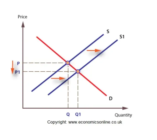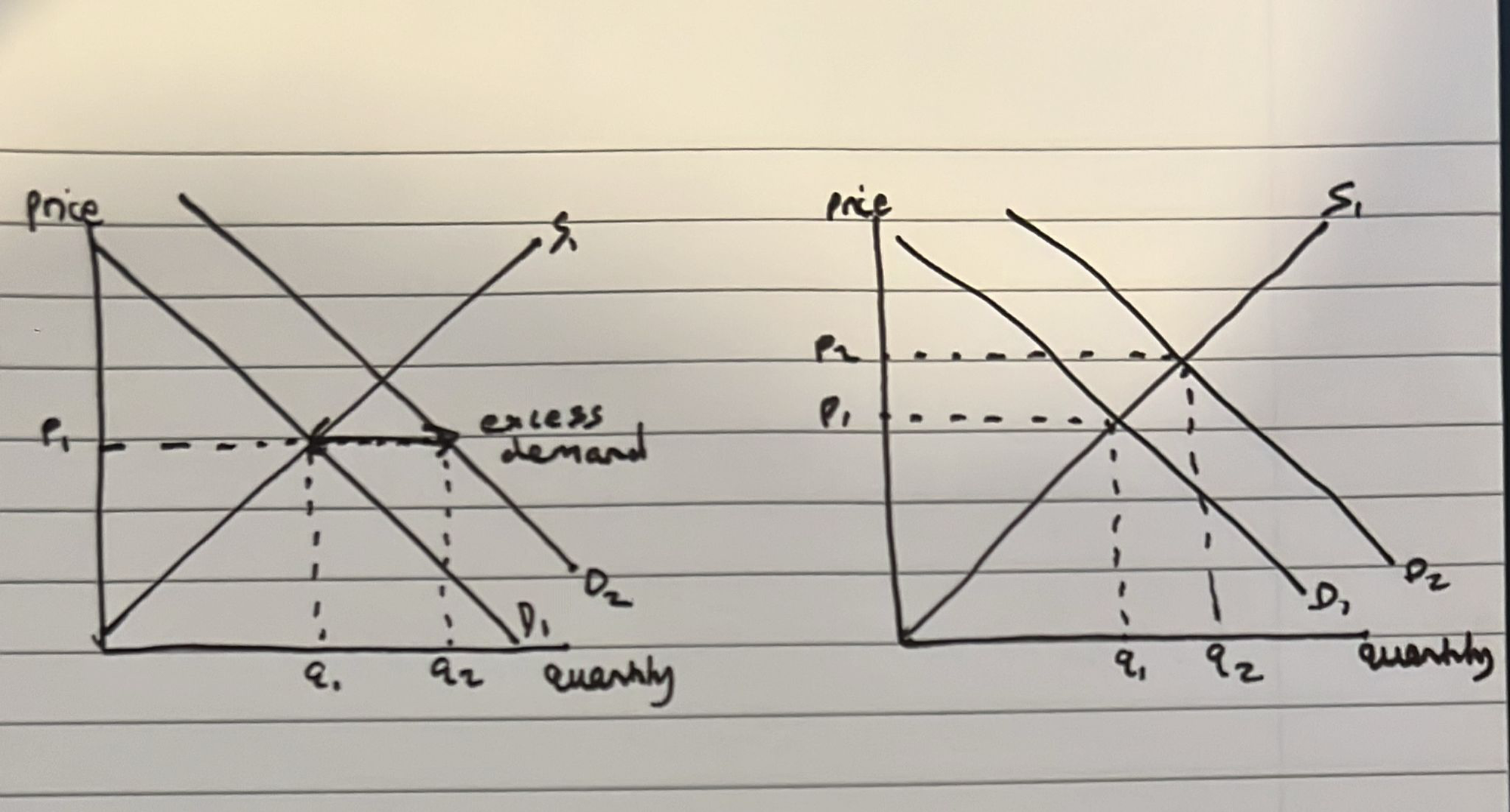 The first diagram shows that, if there is a right shift in demand, there would be very high number of houses (q2) that people are willing and able to buy at p1, but a low number of houses (q1) that firms are willing and able to sell at p1. The gap between q1 and q2 is the excess demand. The market will adjust prices higher and higher until there is a new equilibrium, as shown by the second diagram - at q2 with a price of p2. This is known as the rationing function of the market - higher prices rationed away the excess demand - so houses are bought and sold only by those who are willing and able. The high price also provides a greater profit motive, and this incentivises firms to increase the number of houses available for sale. Hence, there is a higher equilibrium quantity of q2. This is also known as the invisible hand of the market. There is also no risk of government failure.