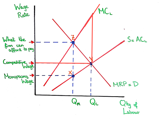 A monopsony is a sole buyer of labour and the diagram above shows that they take advantage of their buying power by setting wage at the quantity where MC = MRP. Therefore the monopsony wage is very low, as shown. The government would be able to implement a minimum wage in this type of market and this leads to wages rising from the monopsony wage anywhere up to the competitive wage and the quantity of labour employed also rises from Qm to Qc. The reason for this is the extortionate profit firms were making when employing labour below their MRP. Even with a new legal minimum wage in place, firms would hire workers at the point where MC = MRP which is much higher now.