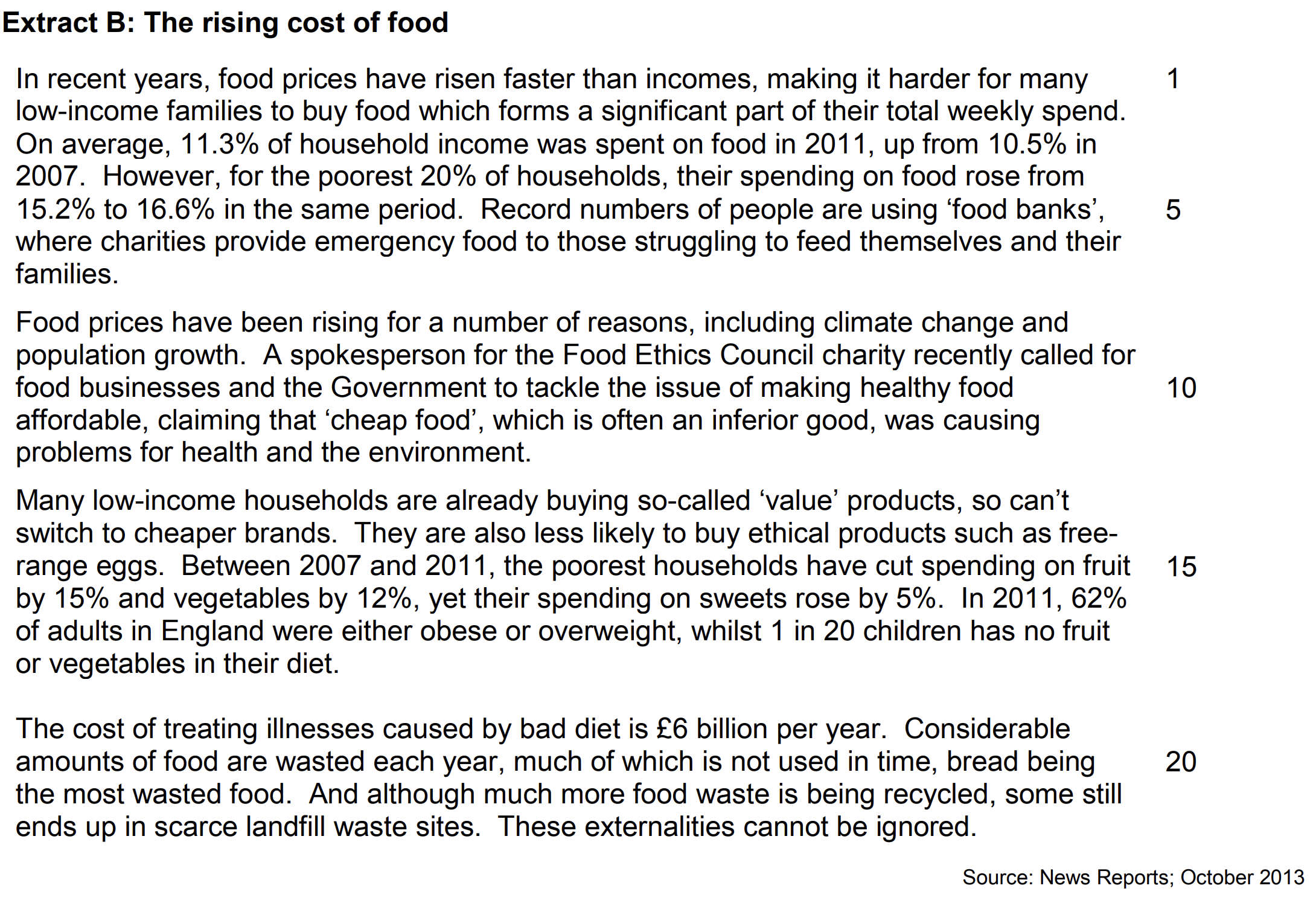 Extract B (line 1) states that ‘In recent years, food prices have risen faster than incomes.’ Explain two possible reasons, other than a change in income, for the rise in the price of food over the period shown. (AS-Level Economics Specimen paper, 10 marks)