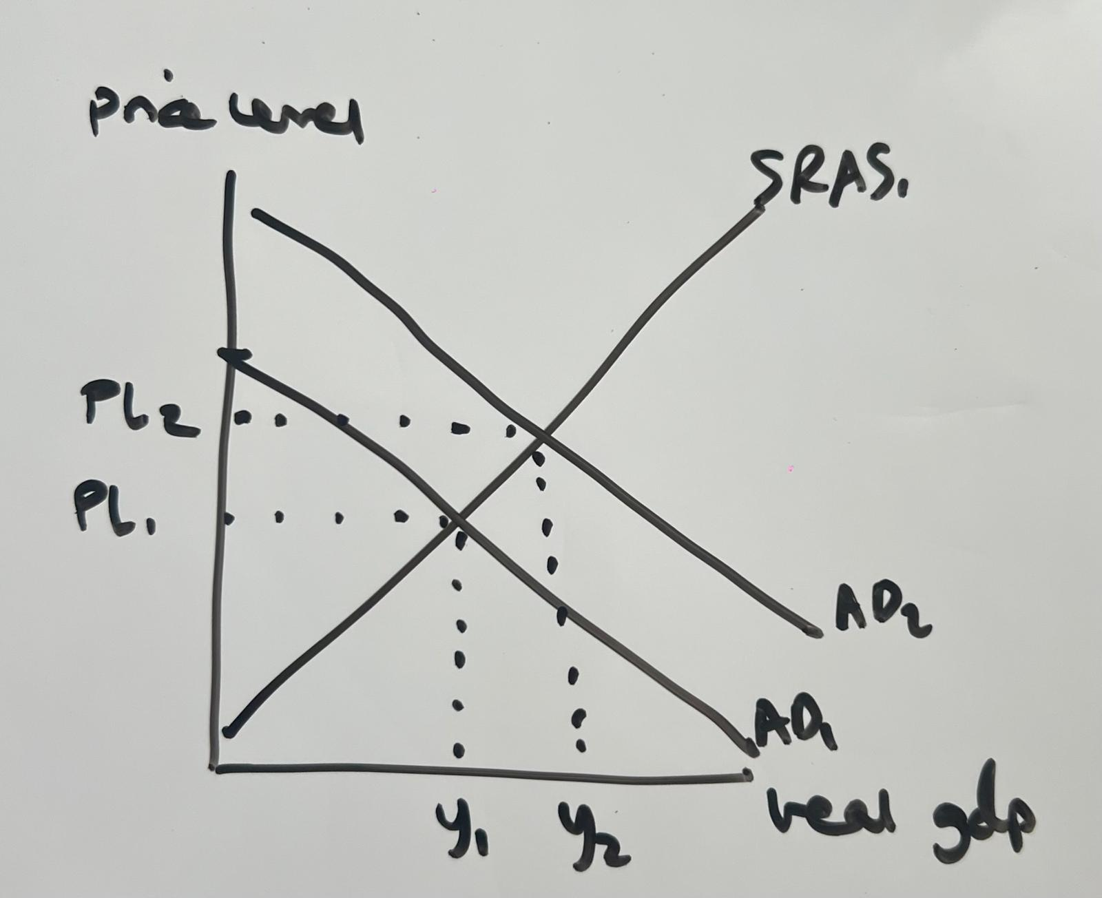 The diagram shows that the right shift in AD causes an increase in real GDP (economic growth) from y1 to y2, which should also lead to a decrease in unemployment as there is a greater demand for workers due to the greater demand for goods and services. There is also an increase in the price level from PL1 to PL2, which is known as inflation. This is because there is more demand chasing the same number of goods and services.