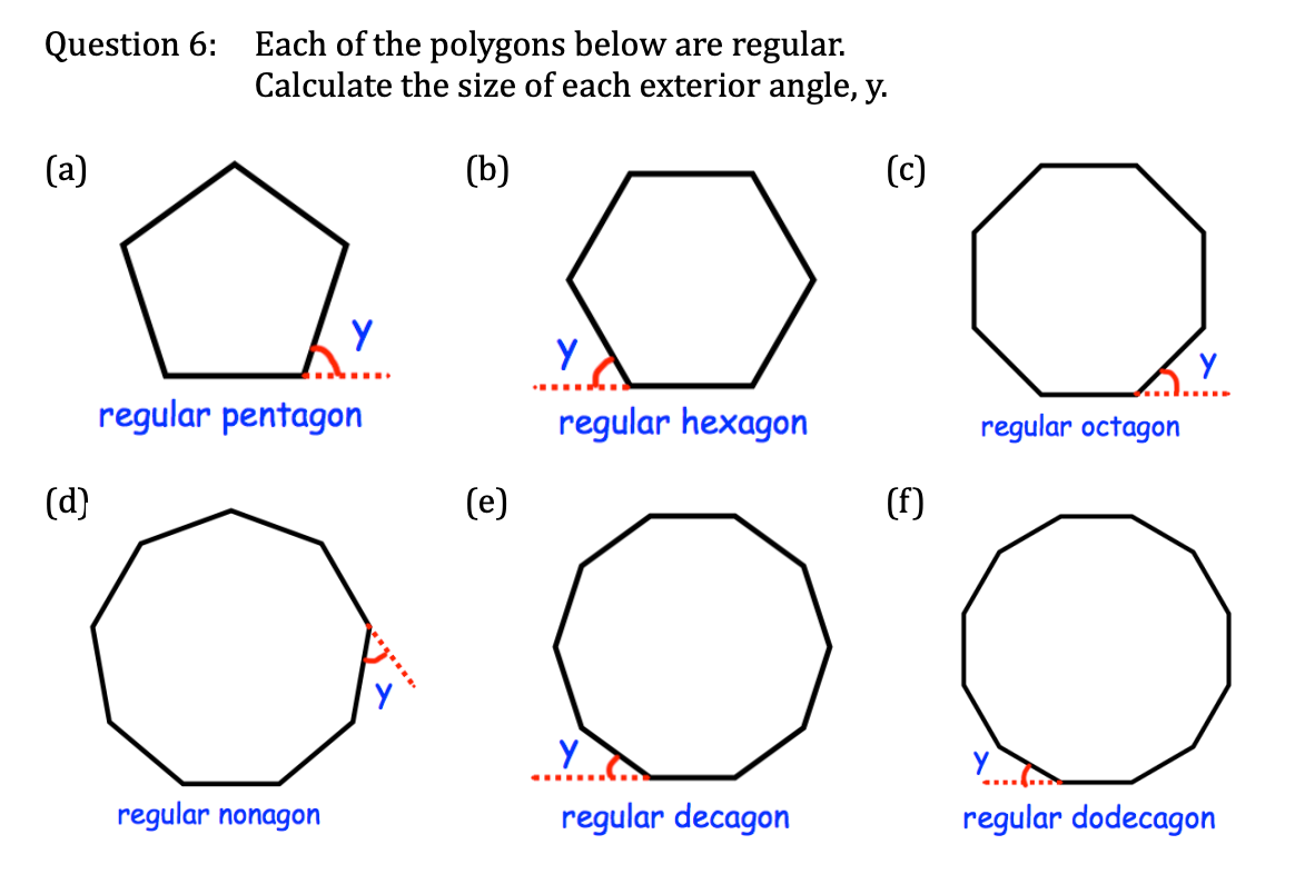 GCSE Maths | Angles in Polygons Last updated on 27 May 2025 The interior angles in a polygon add up to (n-2) x 180oInterior angle + exterior angle = 180oExterior angles add up to 360o One interior angle + one exterior angle = 180oQuestion 1Question 2 Previous GCSE Maths | Product Rule for Counting Next GCSE Maths | Circle Theorems
