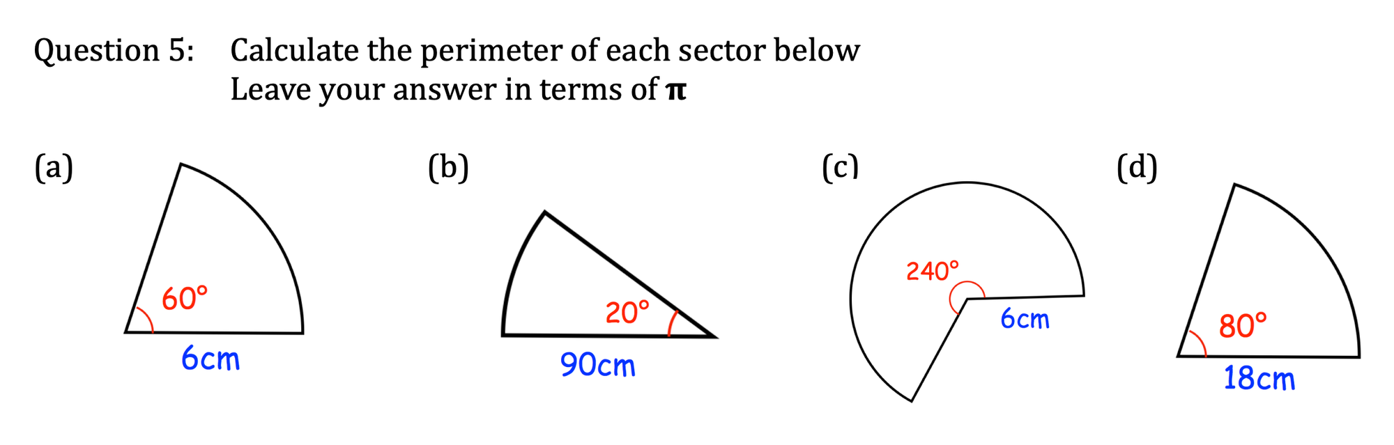 - Area of a sector = πr2 x (x/360o)